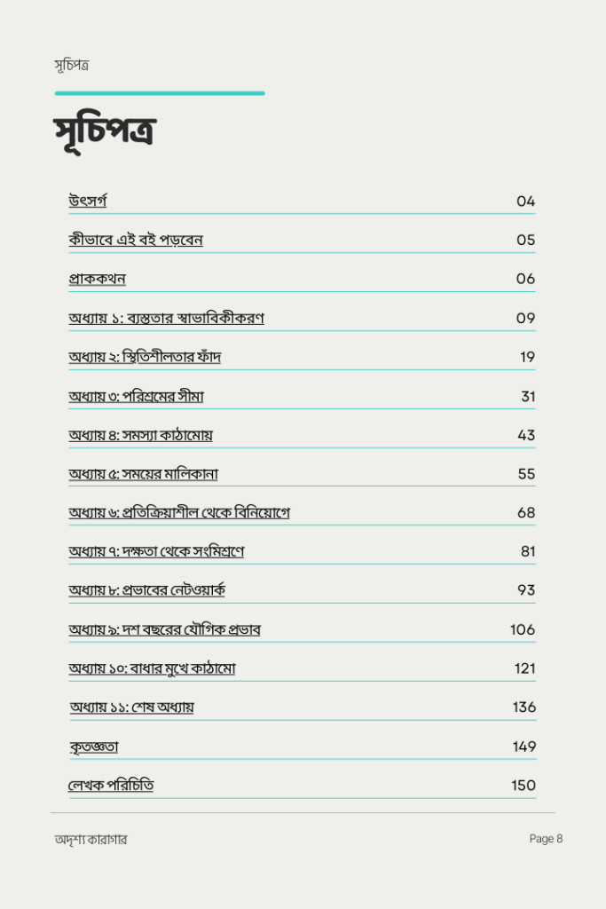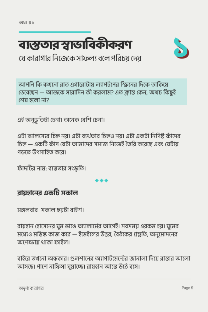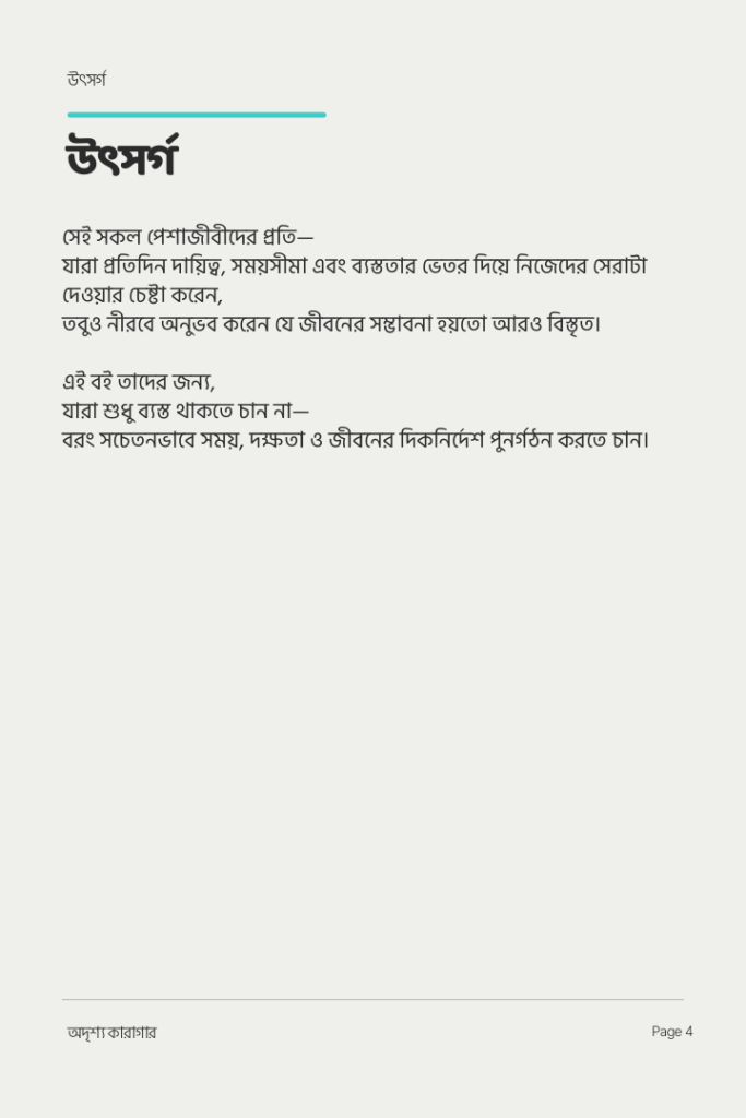 রাত ১১টায় ল্যাপটপের সামনে বসে কি আপনার মনে হয়— “আজ সারাদিন কী করলাম? এত ক্লান্ত কেন, অথচ কিছুই তো শেষ হলো না?” এটি আলস্য নয়, এটি একটি ফাঁদ। যার নাম— ব্যস্ততার সংস্কৃতি। এই বই আপনাকে শেখাবে কীভাবে এই অদৃশ্য দেয়াল ভেঙে প্রকৃত অগ্রগতির পথে হাঁটতে হয়।
